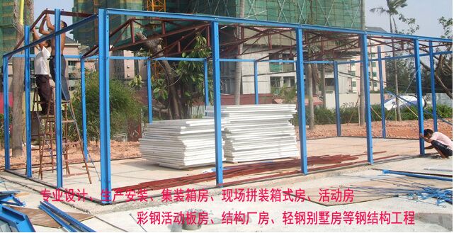 优势特点 活动板房以轻钢结构为主要用料,其特点为:可随意拆装、便于运输、移动方便、节能环保、可重复多次使用,快速安装组合,特稳定性强,抗地震和台风。 使用寿命长,使用周期长达8--20年。 活动房适宜坐落于山坡、丘陵、草原、沙漠、河畔。暂用空间较少,可建造15--500平方米不等,外表美观大方。可按顾客要求进行设计,精致典雅,保温性能好,冬暖夏凉。 活动房大部分结构件在工厂加工完成,散件运输到现场安装,大大缩短施工时间,既不破坏环境又绿色环保,不仅具有实用价值,更具观赏价值,能给你带来高额的回报。